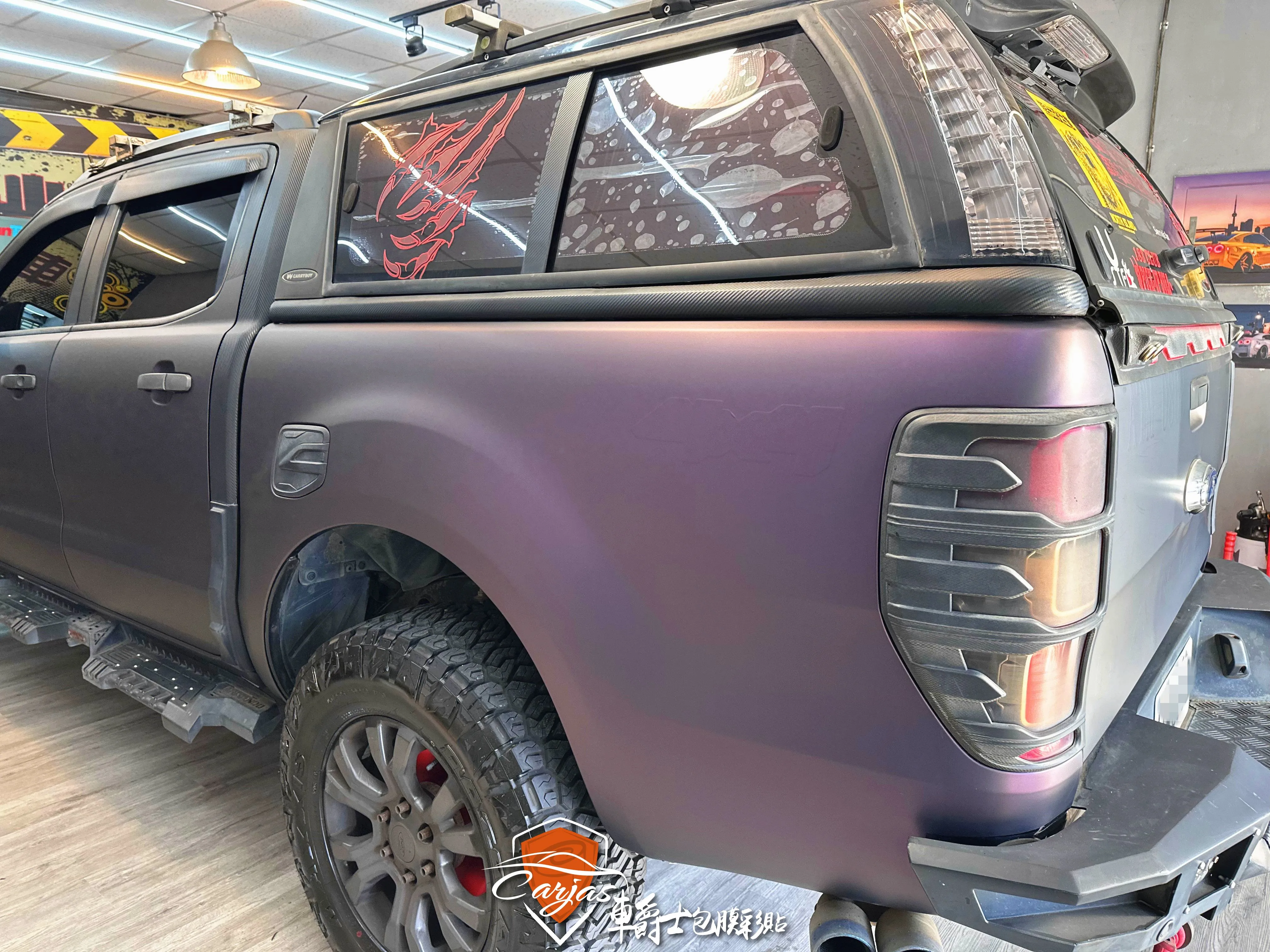 【車款】FORD RANGER 皮卡 【施工項目】全車消光黑幻紫改色包膜/3D黑卡夢改色包膜 車燈燻黑包膜