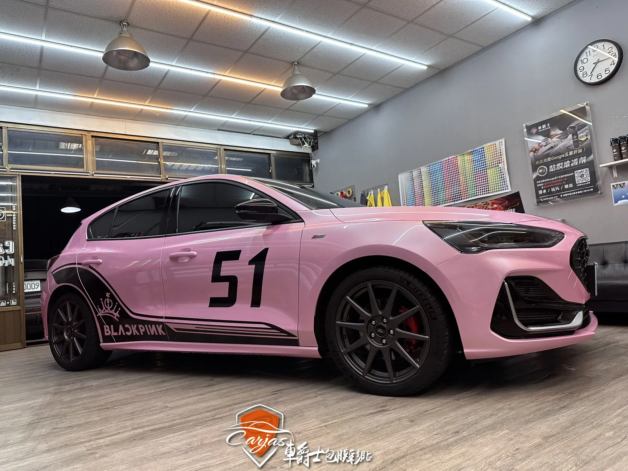 【車款】FORD FOCUS 【施工項目】全車馬卡龍櫻花粉改色包膜、局部車漆透明保護膜&客製設計車身彩貼