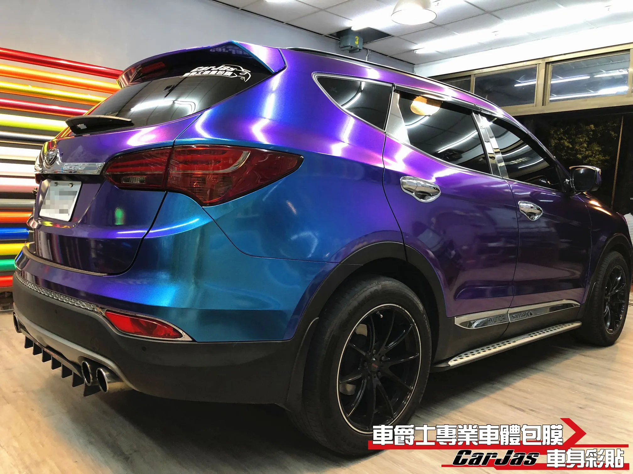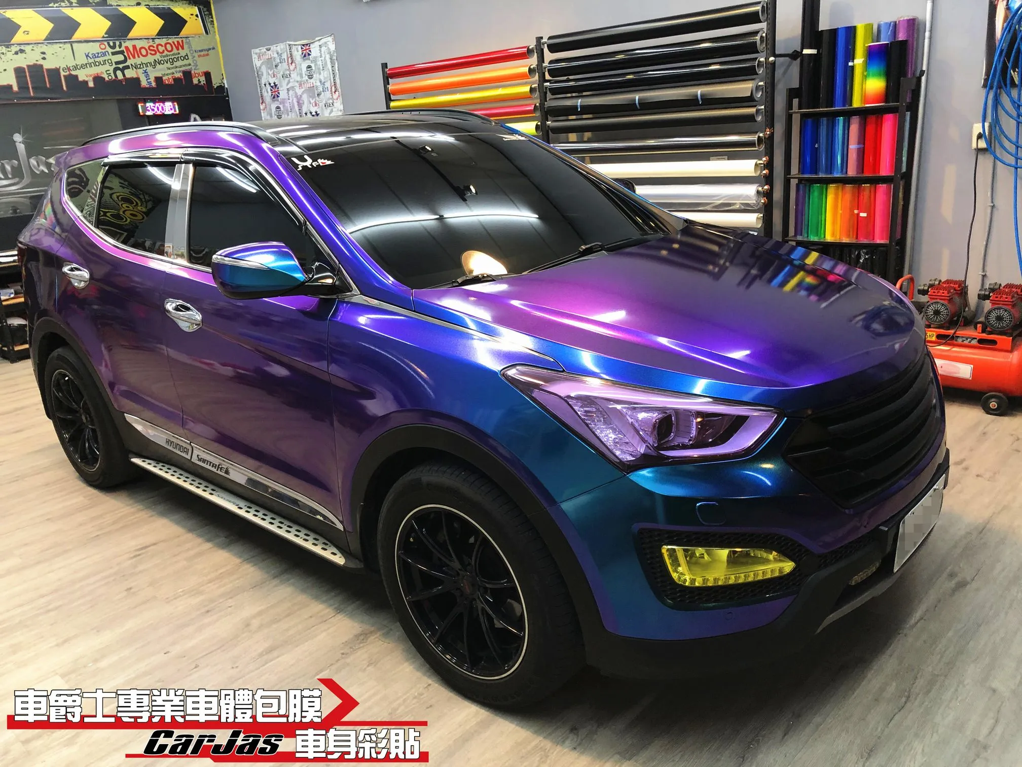 【車款】HYUNDAI SANTA FE 【施工項目】全車奢華變色改色包膜 大燈感光變色紫 尾燈茶色燻黑